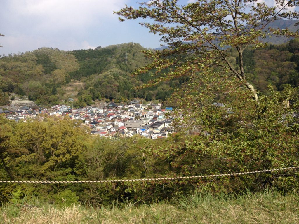 勝山城東側は、桂川が流れている。その向こうの家々が見える。