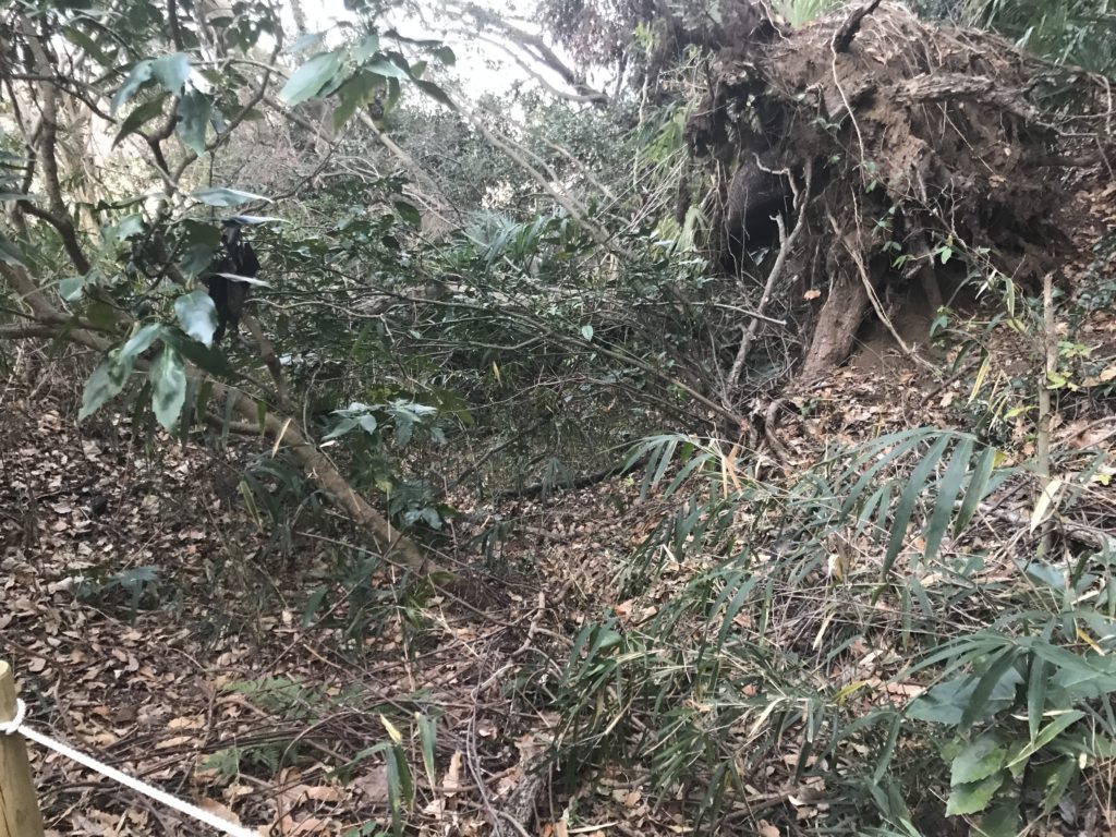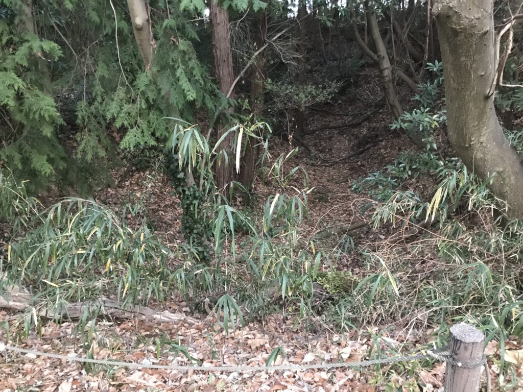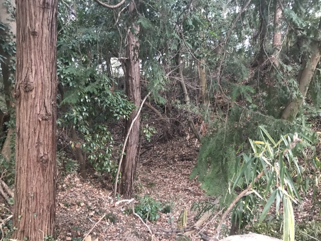 空堀の別角度。現在、空堀の深さは3m~4mはある。空堀沿いに土塁が盛られ、最高6m前後の深さとなる。