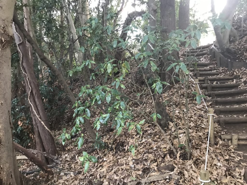 階段左側に、窪みのような場所。腰曲輪の凹み?