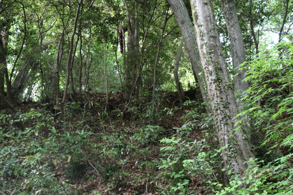 主郭の東側。主郭の東側は、堀切で区切られて3つ小さな曲輪があります。