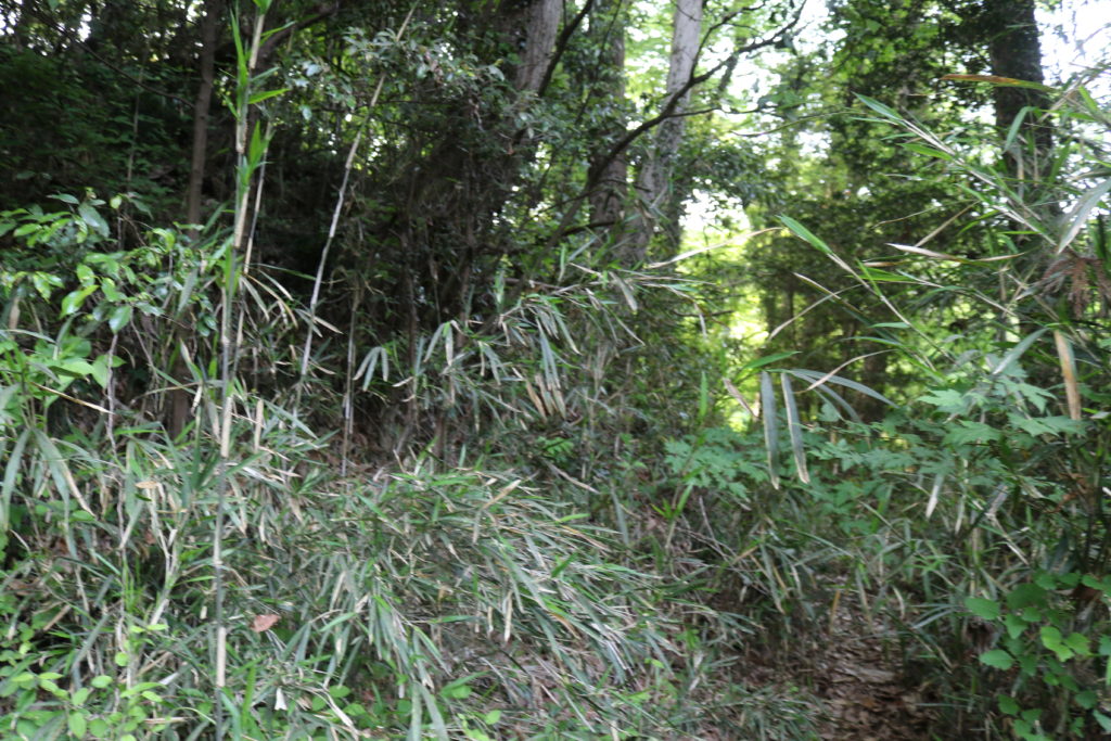 看板の裏あたりから南西方向に行く小道から主郭を見る。